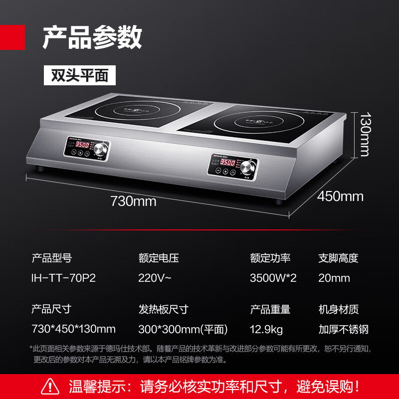 德玛仕(DEMASHI)商用电磁炉 3500W大功率多头电磁炉双头双灶电池炉 台式多眼多头煲仔炉 双平面IH-TT-70P2【220V】价格:1430.00元!