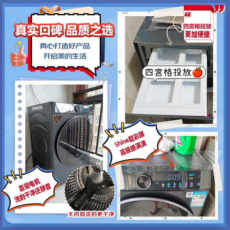 2、外形外观:超薄设计,节省空间!洗净效果:1:1的洗净比,高水准系列。空气洗,除螨洗等功能都有!除菌效果:效果出众,洗完后衣服非常干净。容量大小:10Kg,一家人够用!性价比非常高!