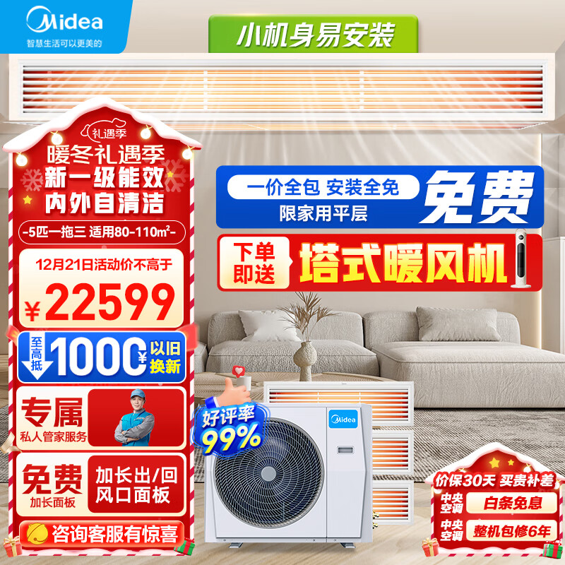 美的(Midea)中央空调一拖三风管机5匹小多联机MDS三代一级能效快速冷暖智能清洁MDS-H120W-A(1)Ⅲ价格:22699.00元!