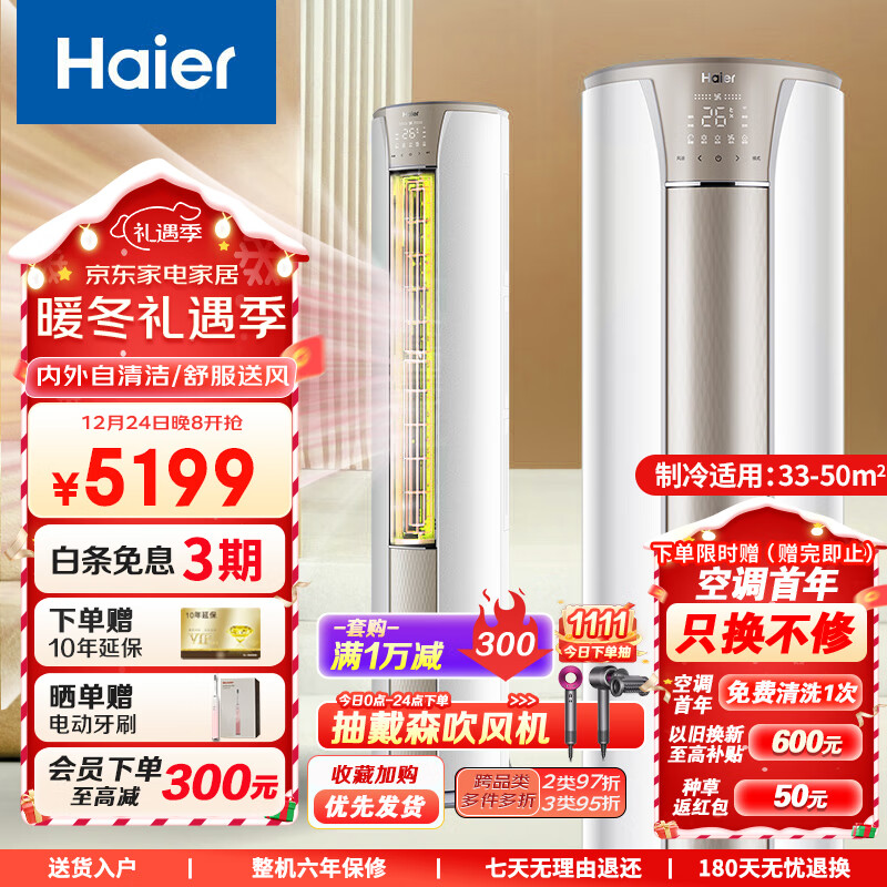 海尔空调3匹 静悦 变频新能效 客厅圆柱空调立式柜机自清洁 京东小家智能 快速制冷 智能物联价格:5399.00元!
