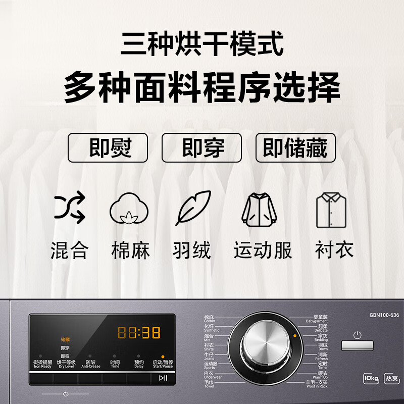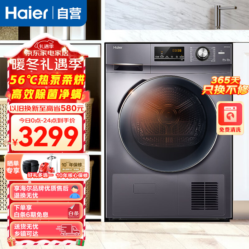 海尔(Haier)10KG热泵烘干机家用干衣机除菌滚筒式 正反转匀烘 衣干即停 免熨烫烘衣机 GBN100-636价格:3199.00元!