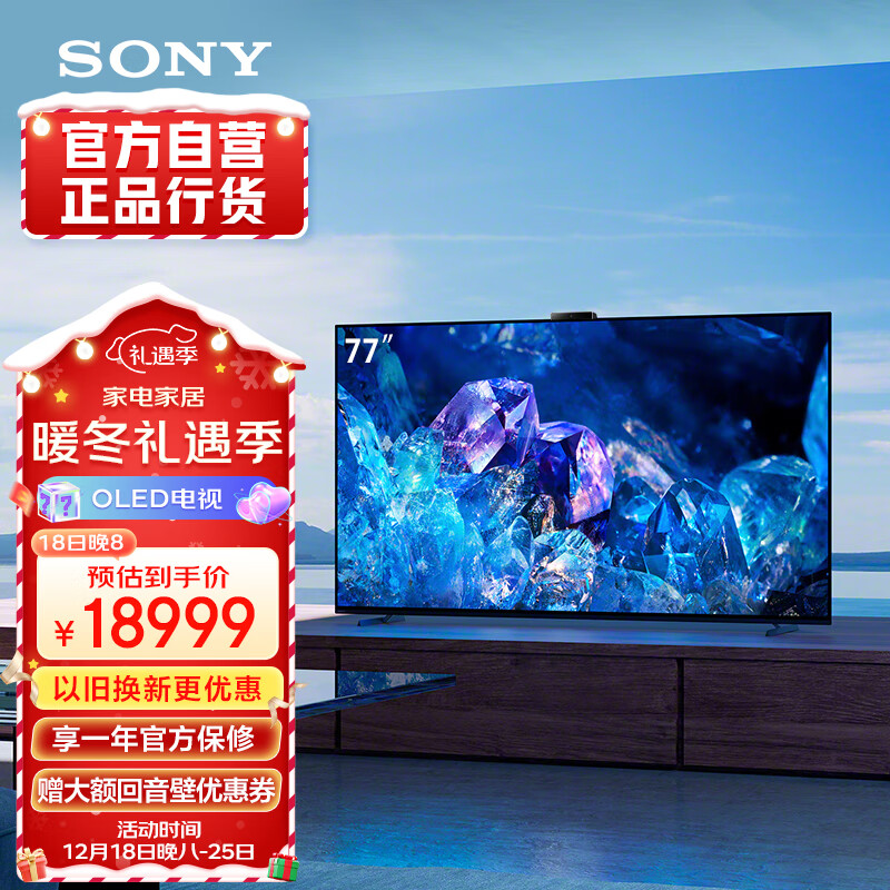索尼(SONY)XR-77A80EK 77英寸 4K OLED智能电视 屏幕发声 搭载摄像头 XR认知芯片 屏价格:18999.00元!