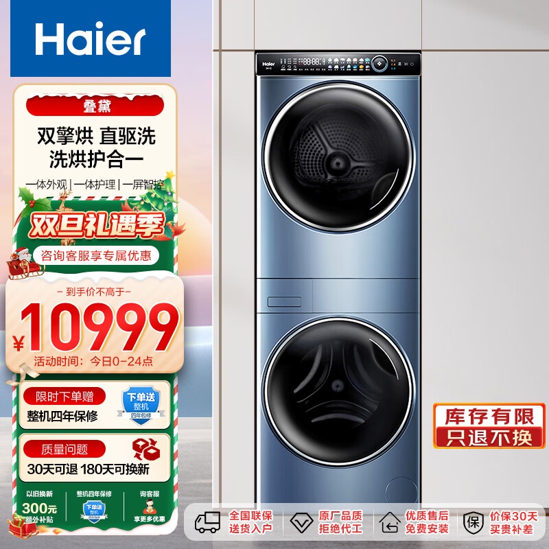 海尔(Haier)叠黛和美洗烘套装 10Kg智投滚筒洗衣机全自动+双擎热泵烘干机家用组合 洗烘护一体 XQG100-BD286U1价格:10977.00元!