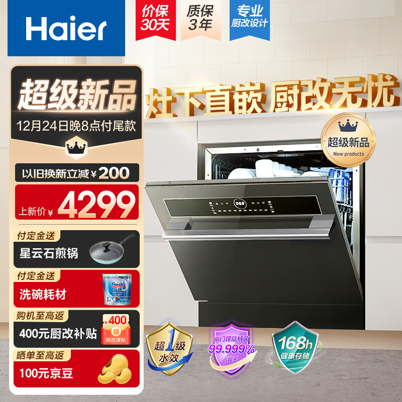 海尔(Haier)12套嵌入式壁嵌家用洗碗机焕新家Z10 洗消一体 高温除菌 一级水效 智能开门速干EBW12327YSU1价格:4299.00元!