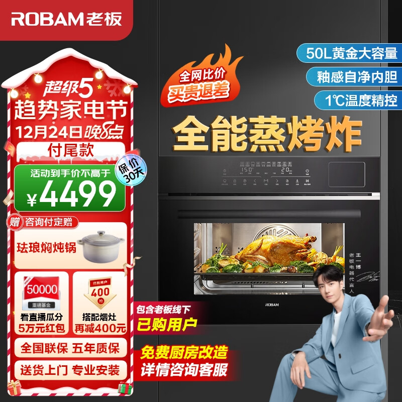 老板(Robam)CQ976D蒸烤箱一体机嵌入式50L家用全能蒸烤炸3合1蒸箱烤箱空气炸专业1℃精控三重自清洁釉感自净价格:4499.00元!