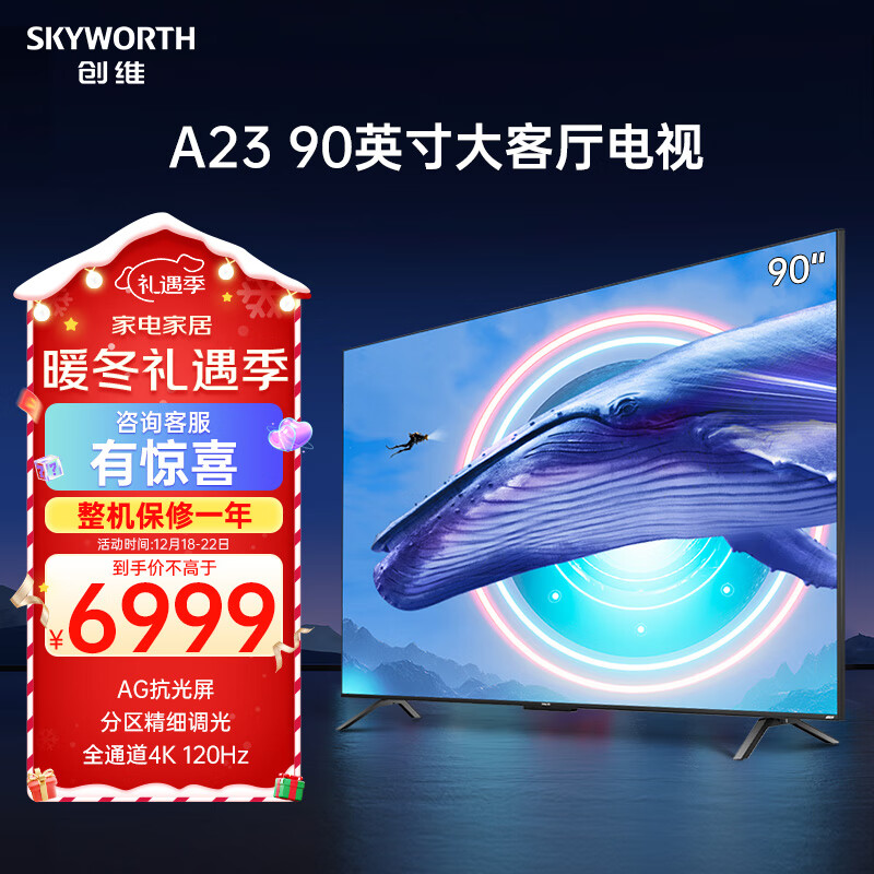 创维电视90A23 90英寸电视机可入户巨幕抗光屏全通道120Hz 3+32G 4K护眼声控屏98 100价格:6999.00元!