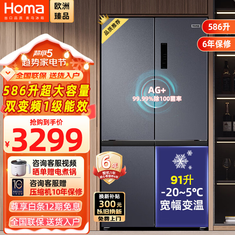 奥马(Homa)欧洲臻品586升超薄大容量十字对开门四门家用变温电冰箱一级能效变频风冷无霜BCD-586WDH/B价格:4599.00元!