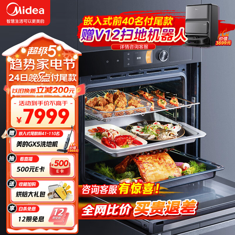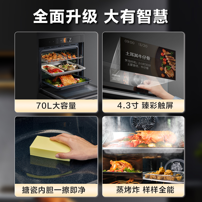 美的(Midea)蒸烤炸一体机嵌入式3合1 TFT彩屏智能交互 R7Pro 70L大容量搪瓷内胆电蒸烤箱空气炸 BS7057W价格:7999.00元!