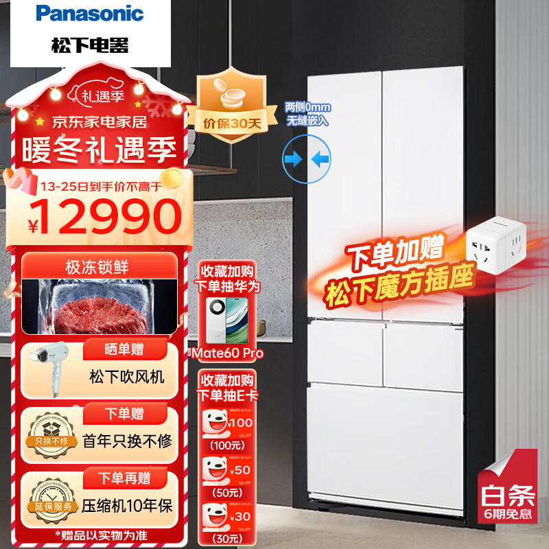 松下(Panasonic)大白PRO 460升家用多门冰箱一级能效五开门大容量580mm超薄嵌入式冰箱NR-JW46BGB-W珍珠白价格:12990.00元!
