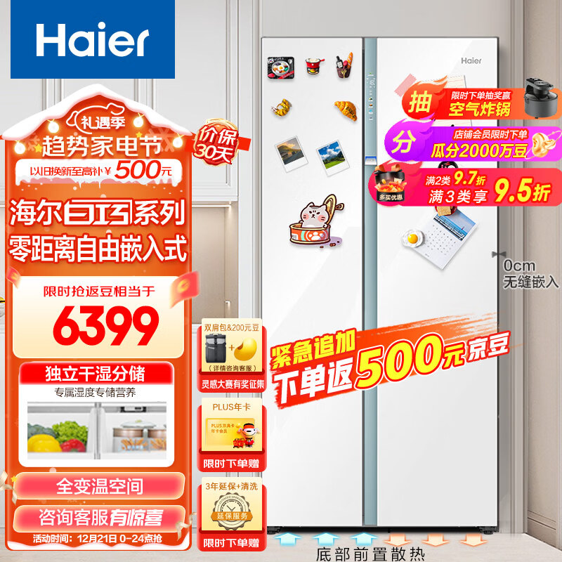 海尔(Haier)白巧系列561L全空间保鲜大冷冻电冰箱家用一级能效变频对开双开门超薄零嵌入式BCD-561WLHSS14W9U1价格:6899.00元!