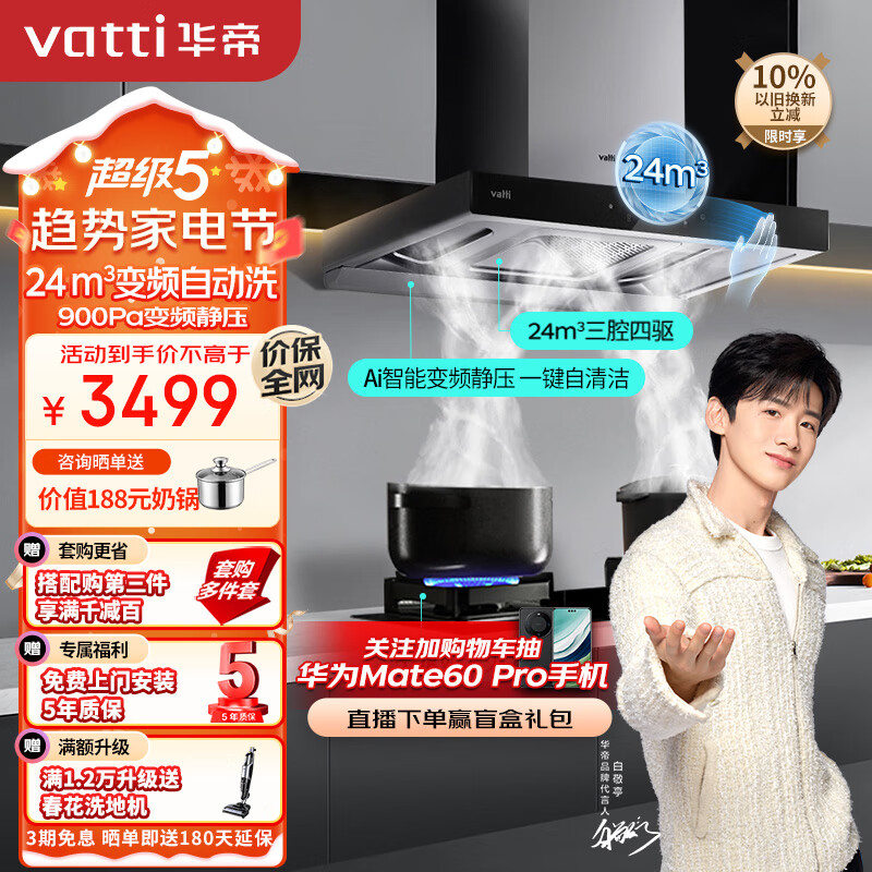 华帝(VATTI)抽油烟机家用顶侧欧式变频大吸力烟机燃气灶烟灶套装24风量自动清洗吸油烟机灶具套装i11206天然气价格:3499.00元!
