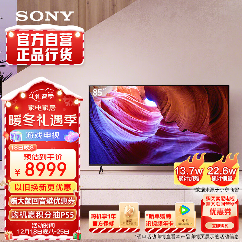 索尼(SONY)【官方直营】KD-85X85K 85英寸 4K HDR 屏智能电视 广色域 120Hz 客厅巨幕 京配上门价格:8999.00元!