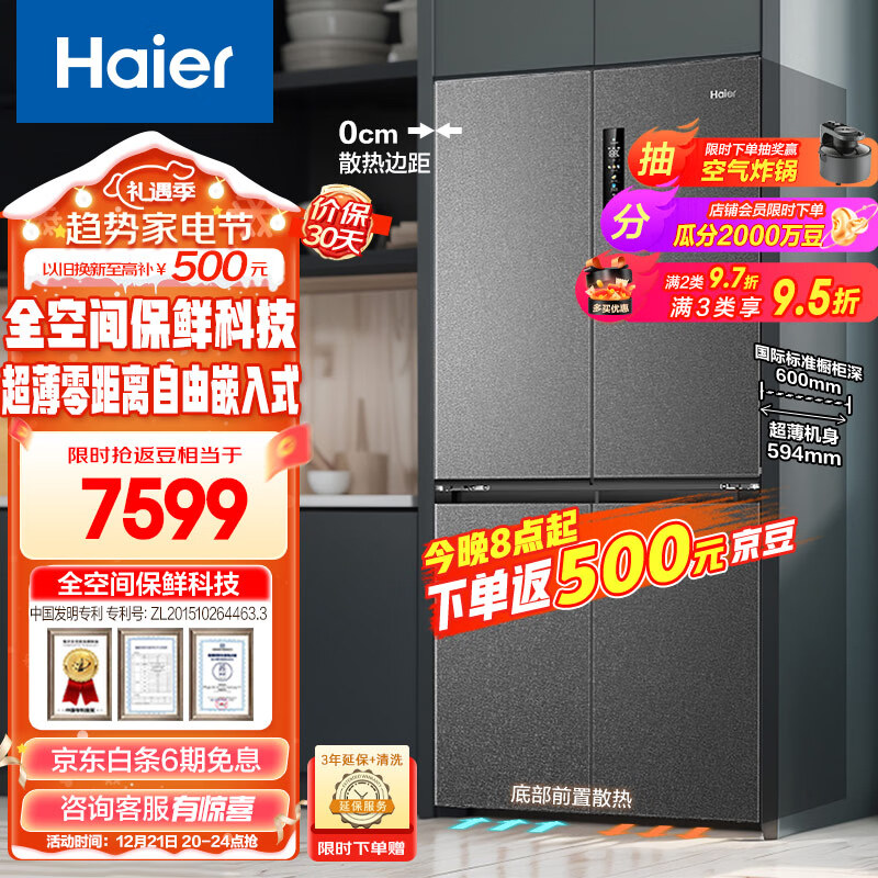 海尔(Haier)518L全空间保鲜超薄零嵌十字双开四开门家用电冰箱除菌超大容量嵌入式60cm以下BCD-518WGHTD1BSYU1价格:8099.00元!