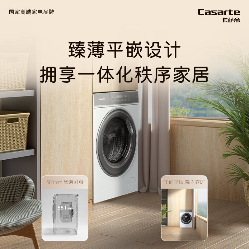 3、阳台做了通铺,需要一款超薄,符合家里尺寸的,又懒,不想要单独的拿出来烘干,就买了一体的,又想要洗的干净,就要求洗净比高,一眼就相中了这款,智能显示屏,父母好操作,这个颜色也很喜欢,卡萨帝的洗衣机是很多人推荐的。