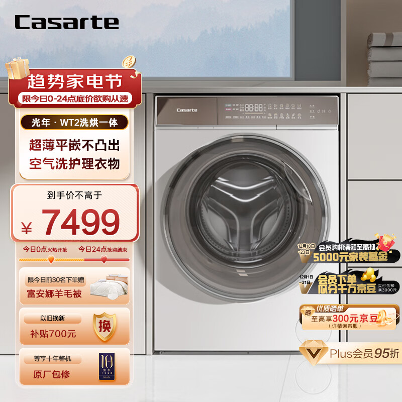 卡萨帝(Casarte)光年WT2滚筒洗衣机全自动 10公斤洗烘一体机 直驱变频电机 UVC紫外除菌 超薄大筒径 HD10WT2ELU1价格:7499.00元!