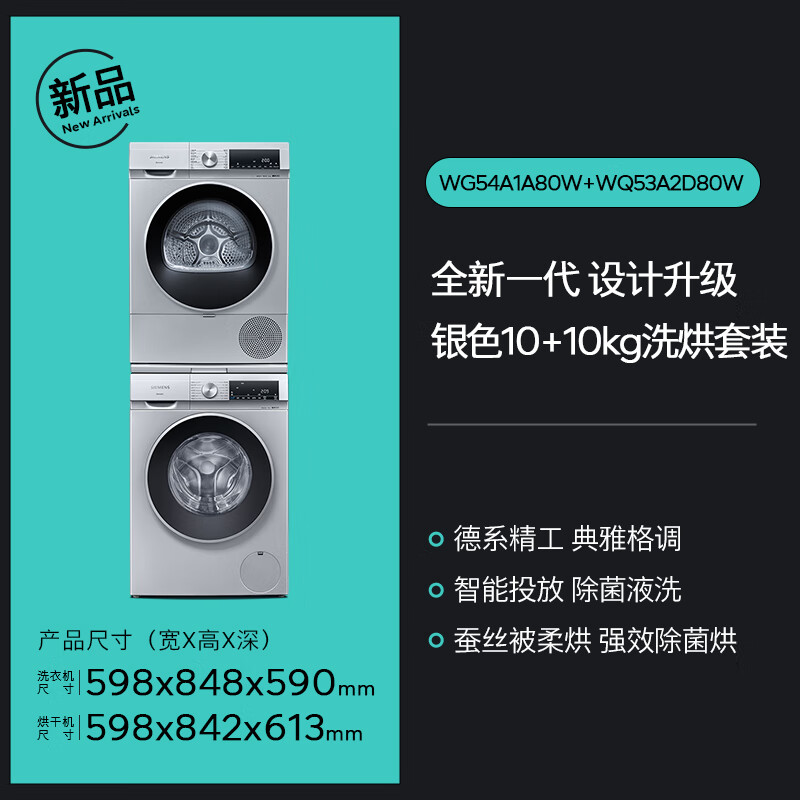 西门子(SIEMENS)iQ300 洗烘套装 10kg 智能投放 防过敏 滚筒洗衣机全自动+10kg热泵烘干机家用防缠绕 A80W+D80W价格:11699.00元!