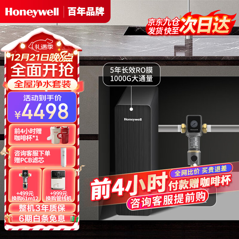 霍尼韦尔(Honeywell)贝加尔系列全屋净水器套装家用厨房直饮净水机RO反渗透纯水机1000G大通量+自动刮洗前置过滤器价格:4498.00元!
