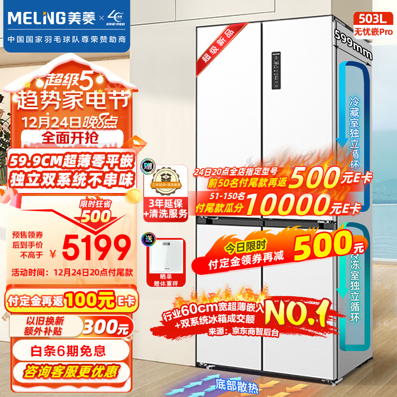 美菱(MeiLing)无忧嵌503升十字对开四开门超薄嵌入冰箱家用变频一级能效BCD-503WPU9CZX白色双系统双循环大容量价格:5698.00元!