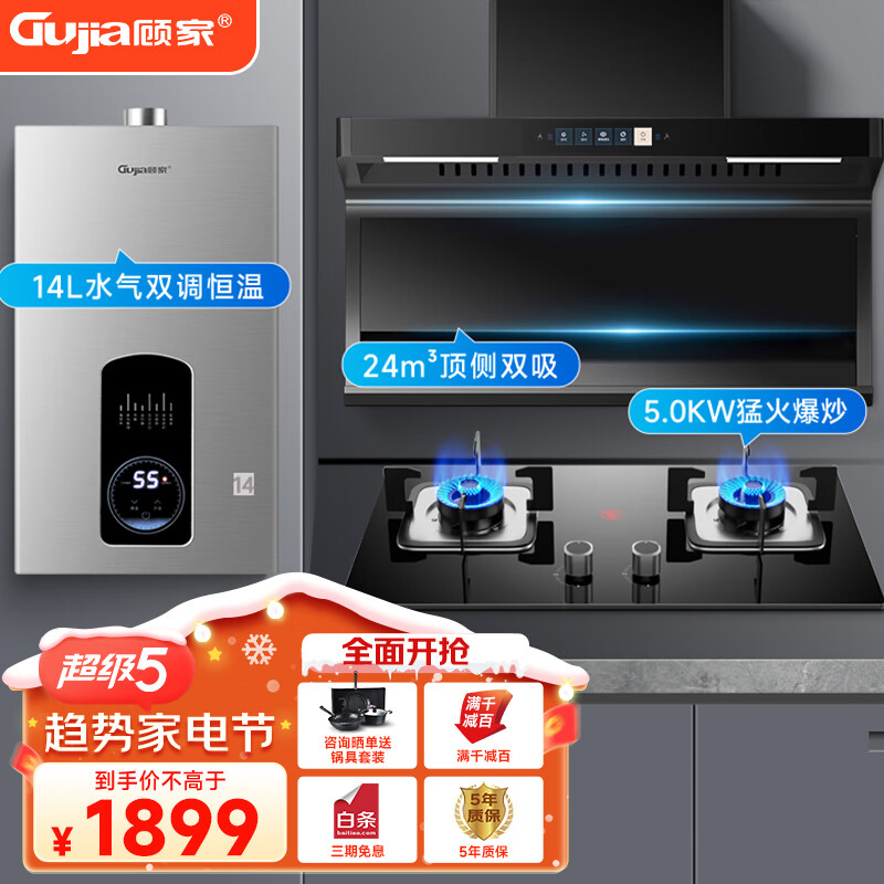 顾家(Gujia)顶侧双吸抽油烟机燃气灶烟灶套装家用厨房大吸力脱排式7字吸油烟机灶具套装 【性价比三件套】烟灶+14L燃热(天然气)价格:2299.00元!