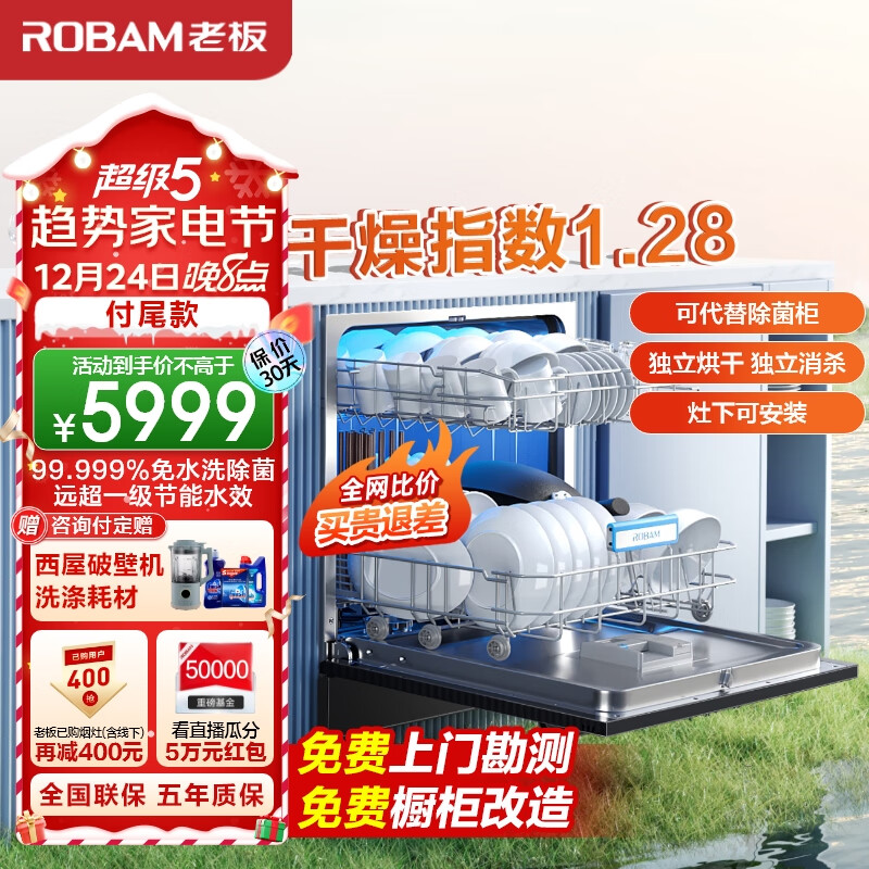 老板(Robam)sD1H代替除菌柜12套灶下洗碗机嵌入式洗消一体机105度光焱独立烘干消毒168h长效存储一级水效价格:5999.00元!