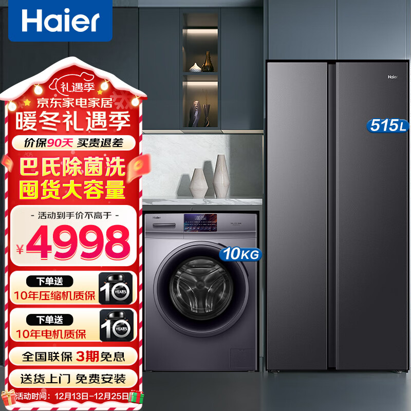 海尔(Haier)冰洗套装 515升一级能效双变频大冷冻超薄对开门冰箱+10KG大容量全自动滚筒洗衣机价格:4998.00元!