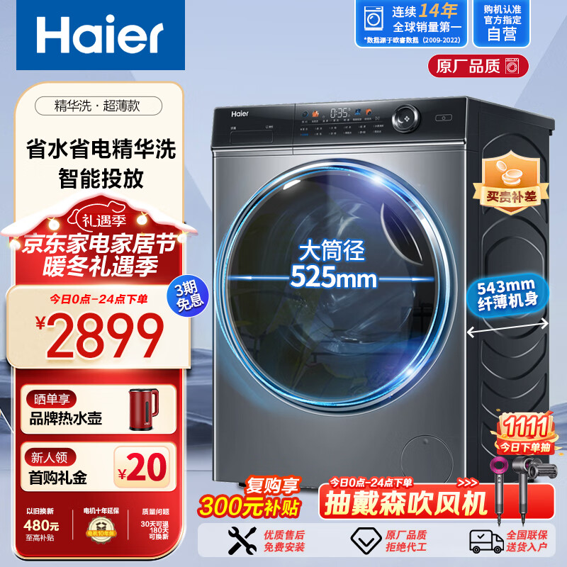 海尔(Haier)10KG全自动变频滚筒洗衣机 大容量智能投放大筒径双喷淋 精华洗省水省电 以旧换新 14126升级款价格:2799.00元!