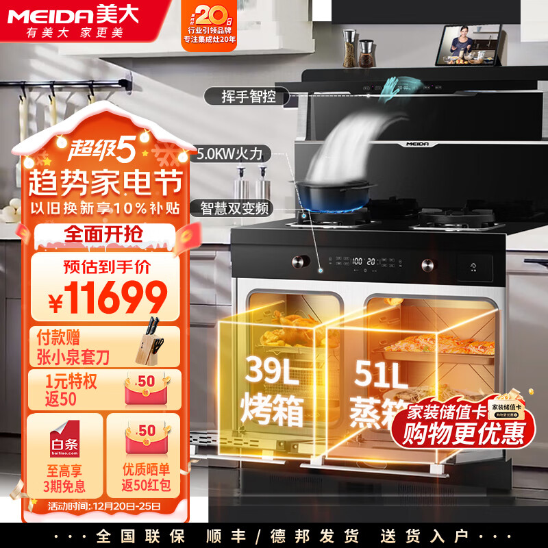 美大(Meida)集成灶V9-MAX蒸烤一体升级独立蒸烤款 左烤炸右蒸炖款家用集成灶燃气灶(液化气)价格:11699.00元!