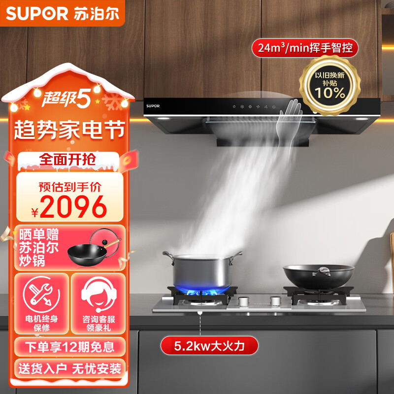 苏泊尔(SUPOR)抽油烟机燃气灶套装 欧式烟灶套装 24立方变频风压挥手智旋干洗吸油烟机DT39+DS35天然气价格:2296.00元!