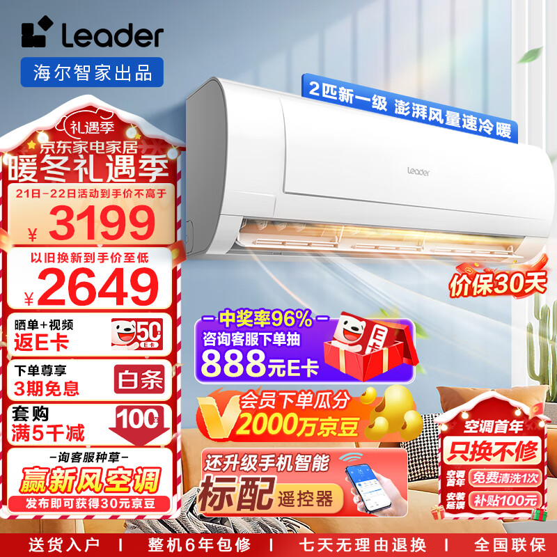 Leader空调 海尔智家出品 2匹新一级客厅变频空调挂式 自清洁空调挂机 KFR-50GW/18MDA81TU1价格:3199.00元!