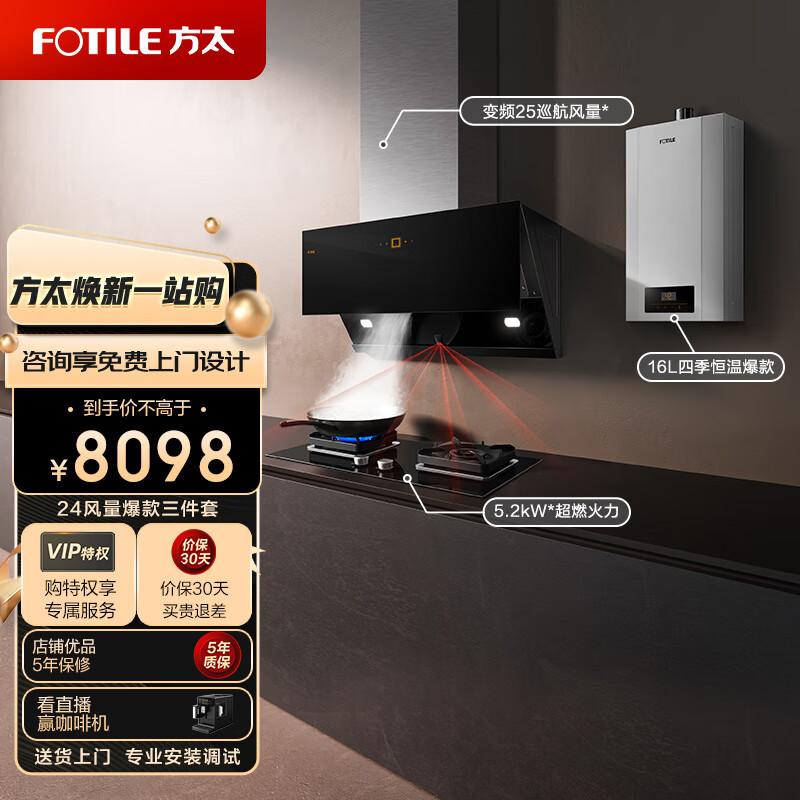 方太(FOTILE)侧吸烟灶热三件套 25风量巡航抽油烟机 5.2kW燃气灶 恒温燃气热水器JCD11T+02-TH27B+P16D1价格:8098.00元!