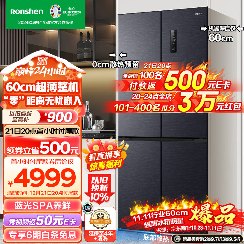 容声(Ronshen)60厘米薄505升十字对开四开门超薄可嵌入式冰箱家用变频一级能效底部散热BCD-505WD1FPQ超大容量价格:5999.00元!