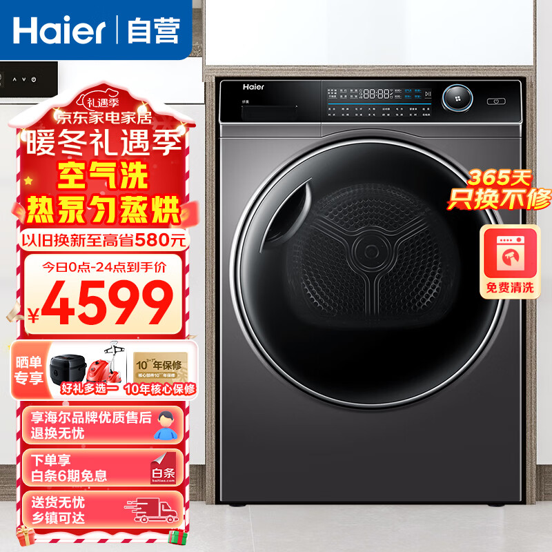 海尔(Haier)烘干机 10KG全自动 双擎热泵 正反转匀烘 衣干即停 空气洗线屑过滤价格:4599.00元!