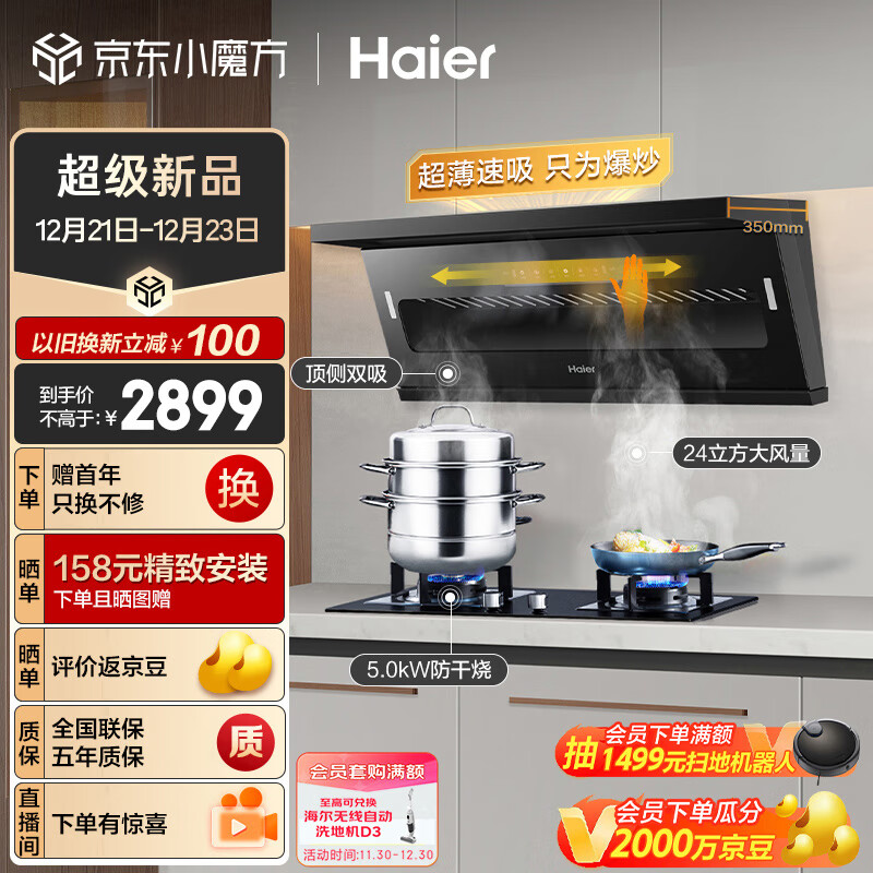 海尔(Haier)抽油烟机 顶侧双吸烟灶套装 24m3/min大吸力 5.0kw防干烧 家用油烟机燃气灶具套装C51+QE9B1天价格:2899.00元!