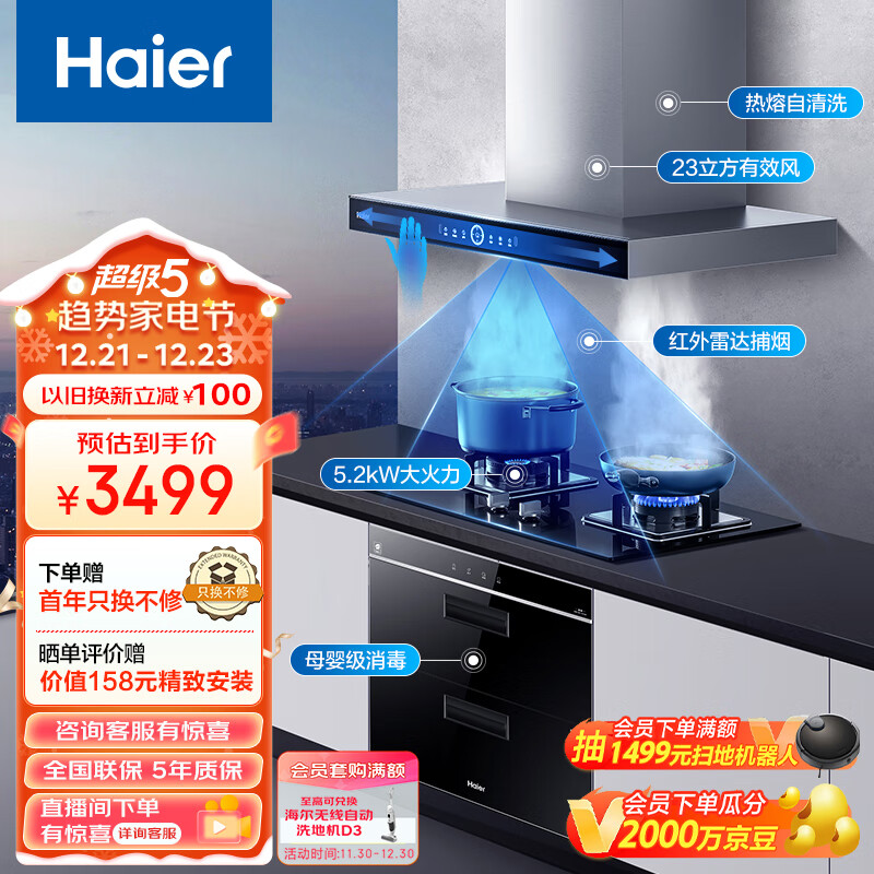 海尔(Haier)抽油烟机 顶吸烟灶消三件套 23m3/min有效风 5.2kw大火力 母婴级消毒 ET931+Q2BE3(天)+12lCS1价格:3499.00元!