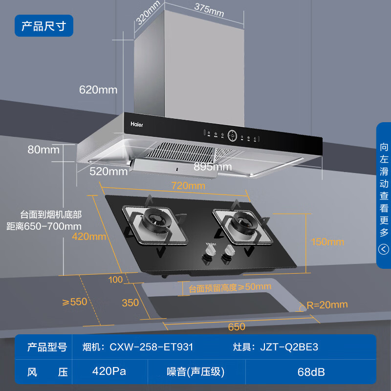 2、油烟机不错,吸力挺大的,噪音还可以能接受,自热清洗功能刚买来还没使用,后期再做评价。海尔的售后挺不错,家里很多电器都是买的海尔的。