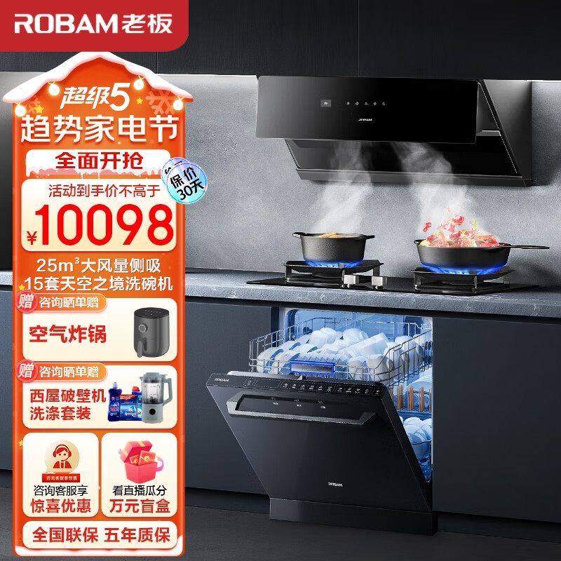 老板(Robam)探索家A8CS 25大风量抽油烟机15套洗碗机嵌入式独立式两用厨房多件套29A8CS+57B6DT+F80D黑价格:10098.00元!