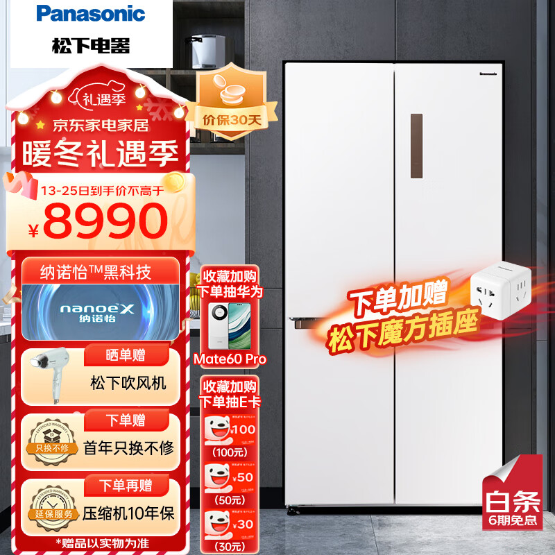 松下(Panasonic)冰箱550升四门十字对开门冰箱纤薄嵌入一级能效纳诺怡X磨砂白家用冰箱优选NR-EW55CPA-W价格:8990.00元!