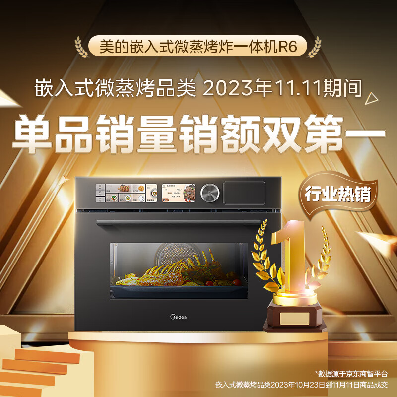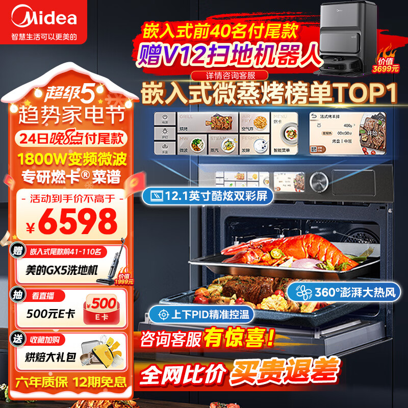 美的(Midea)微霸嵌入式微蒸烤炸炖5合1蒸烤箱一体机GR6 55L家用 大热风脱脂燃卡全域双彩屏智能操控蒸箱烤箱R6价格:6598.00元!