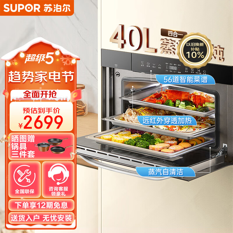苏泊尔(SUPOR)嵌入式蒸烤箱一体机家用蒸箱烤箱电炖空气炸4合1 40L大容量56道智能菜单DY55蒸烤箱价格:2375.00元!