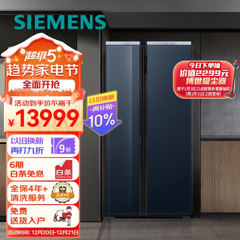 西门子(SIEMENS)630升冰箱双开门对开门智能变频无霜恒鲜 家用大容量囤货玻璃面板湖蕴蓝以旧换新 KX63ES56TI价格:13999.00元!