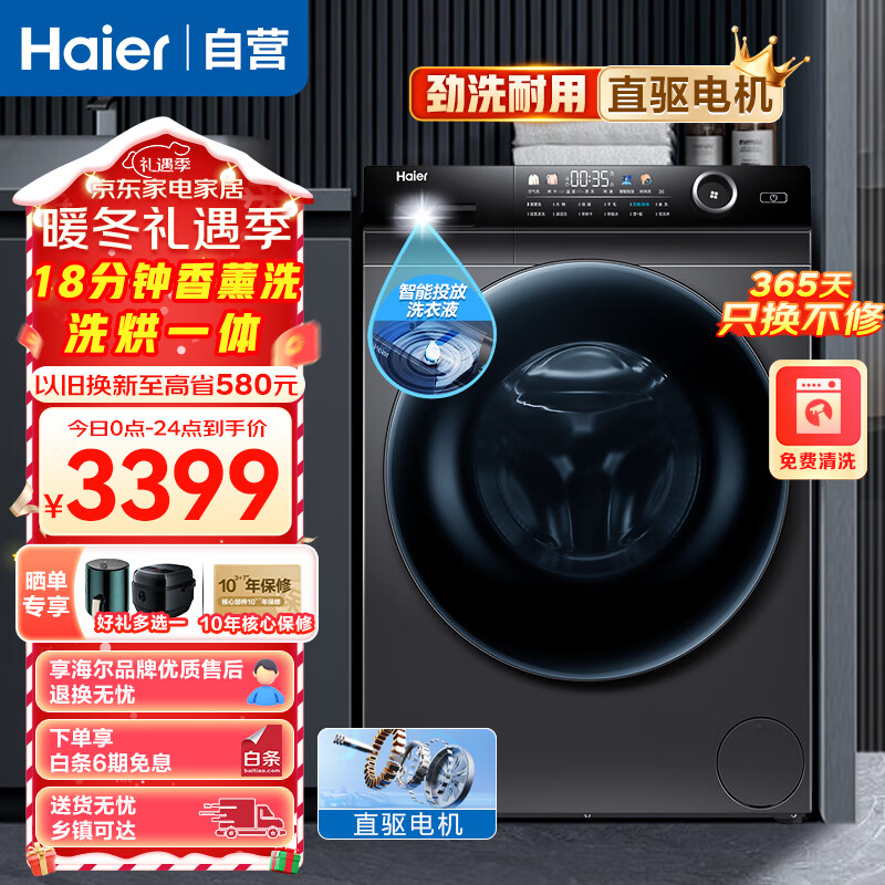 海尔(Haier)洗烘一体机全自动洗衣机滚筒10KG直驱变频智能投放微蒸汽空气洗香薰洗摇篮洗价格:3399.00元!