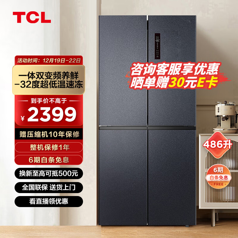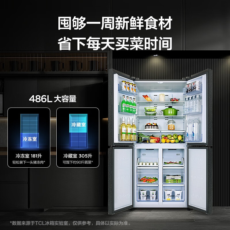 TCL 486升大容量养鲜冰箱十字对开门四开门双变频风冷无霜冰箱 一级能效 京东小家电冰箱BCD-486WPJD价格:2399.00元!