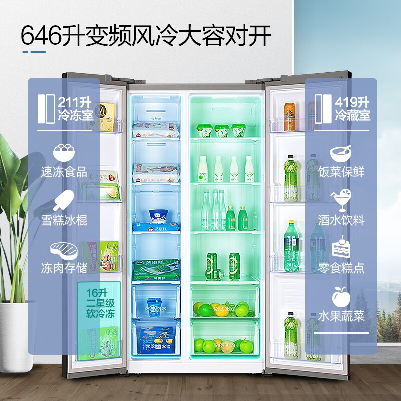 新飞(Frestec)646升双开门对开门多维风冷无霜变频一级电脑控温冰箱超大容量 BCD-646WK9AT价格:2599.00元!