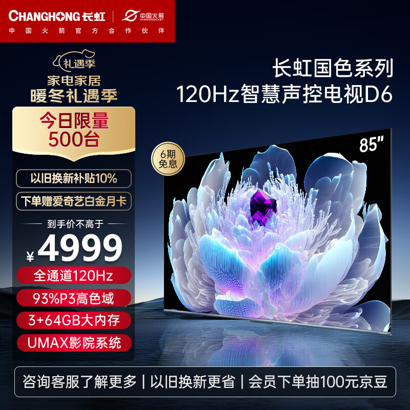 长虹电视85D6?85英寸120Hz高刷游戏电视 P3高色域 杜比视界 3+64GB MEMC 4K平板液晶LED电视机以旧换新价格:4699.00元!