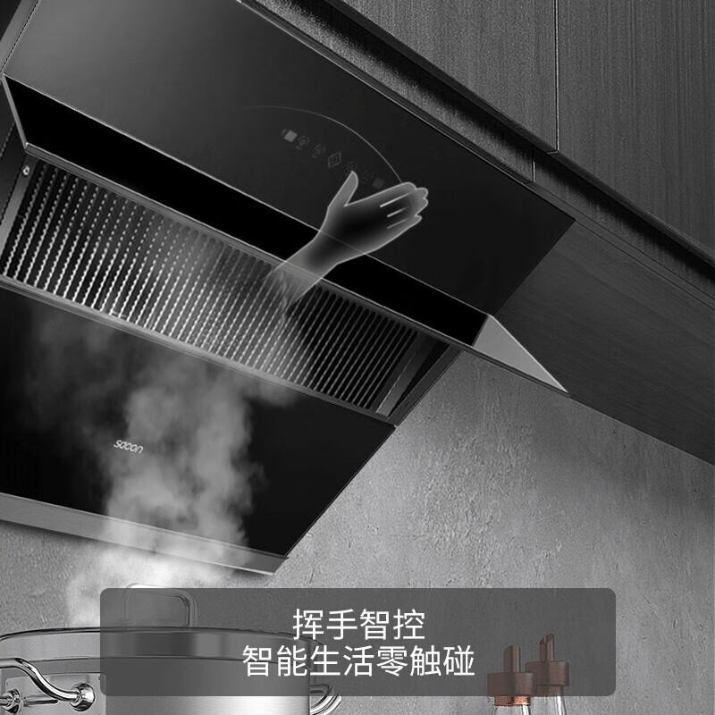 3、给父母家买的油烟机,没有吊柜装着也挺合适的,界面清晰易操作,挥手开关功能也很方便,算是性价比高的一款。