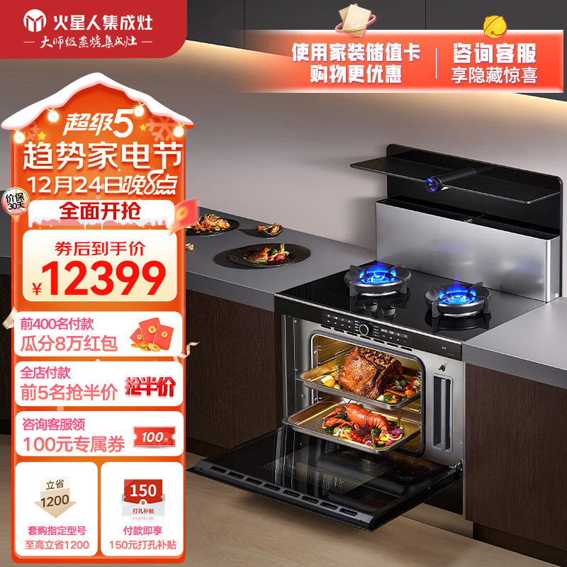 火星人集成灶T70BC 集成灶蒸烤一体 智能蒸烤炸 家用蒸箱烤箱 燃气灶液化气价格:12899.00元!