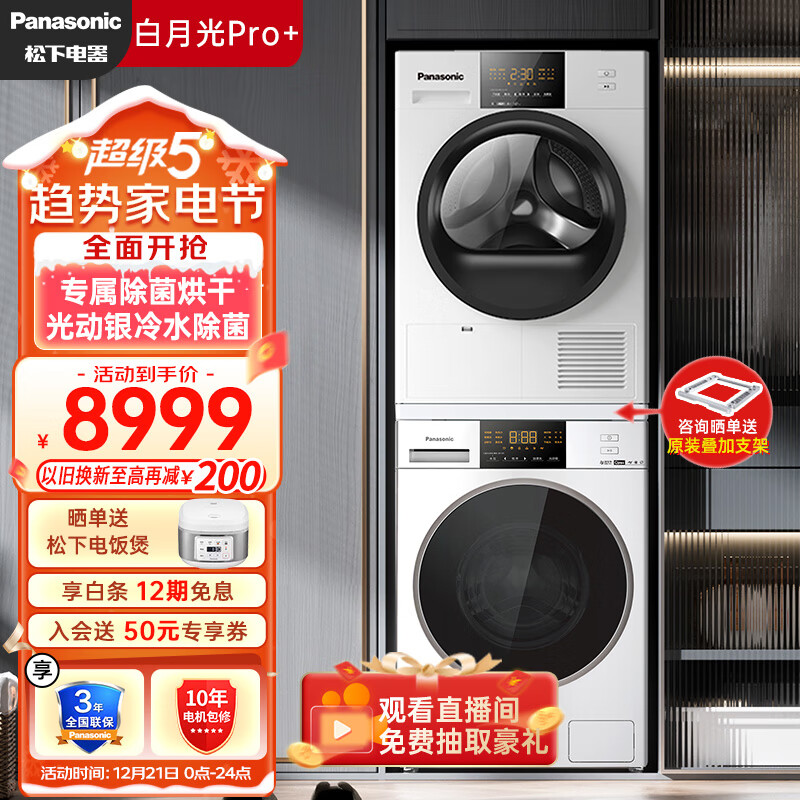 松下(Panasonic)洗烘套装 白月光Pro+ 10kg滚筒洗衣机+热泵烘干机 光动银除菌 1.1洗净比 羽绒服烘 3E1AK+EH31JW价格:9899.00元!