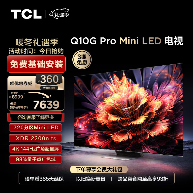 TCL电视 75Q10G Pro 75英寸 Mini LED 720分区 2200nits 4K 144Hz 2.1声道音响 液晶智能平板电视机价格:7999.00元!