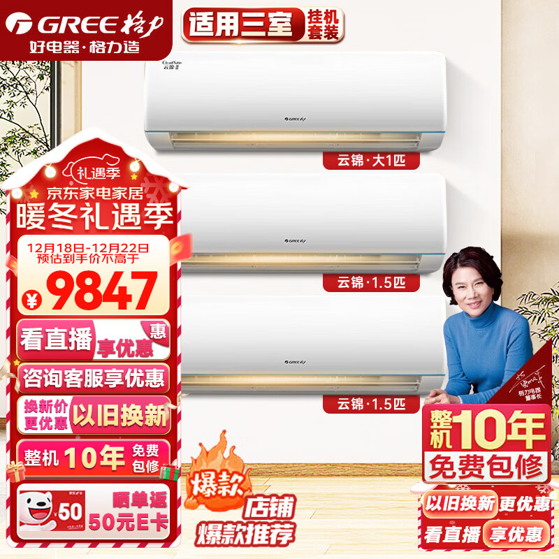 格力(GREE)56℃净菌自洁 智能空调组合套装(1匹云锦一级挂机+1.5匹云锦一级挂机*2台)价格:9847.00元!