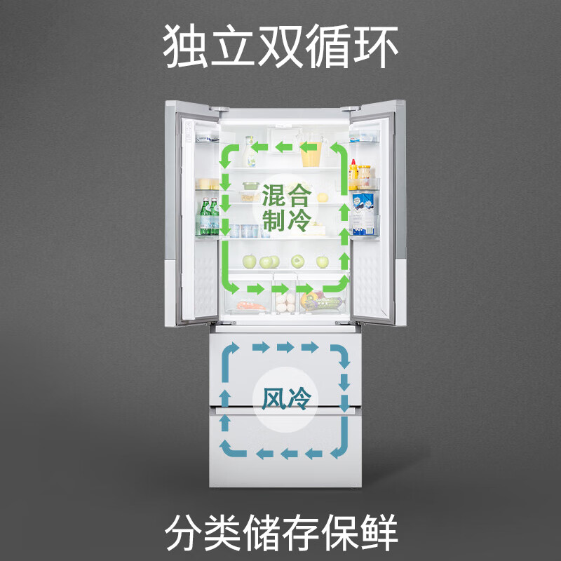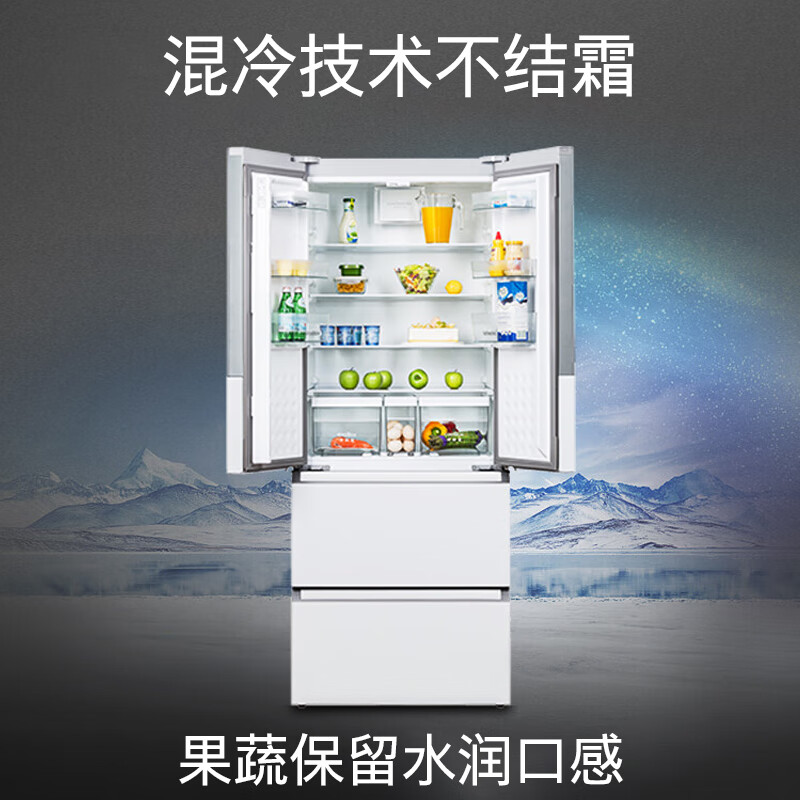 5、颜值很高的一款法式四门冰箱,空间足够大,能放不少东西,而且分区明确,特别喜欢下面的大抽屉,轻松放入各种形状的食材,运行起来没什么声音,挺安静。送货师傅很辛苦,一个人搬运这么重的冰箱很不容易